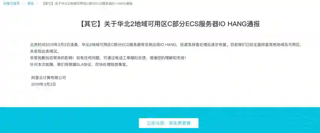 阿里云方面表示,从 3 月 2 日 23:55 分左右开始,监控发现华北 2 地域可用区 C 部分 ECS 实例状态异常。