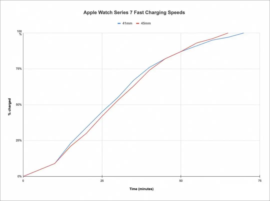 上一代的Apple Watch Series 6 至少需要两个小时才能充满电,但 Apple Watch Series 7 Cellular 版本几乎将充电时间减少了一半。在一系列测试中,Apple Watch Series 7充满电的时间在大约在65到75分钟。