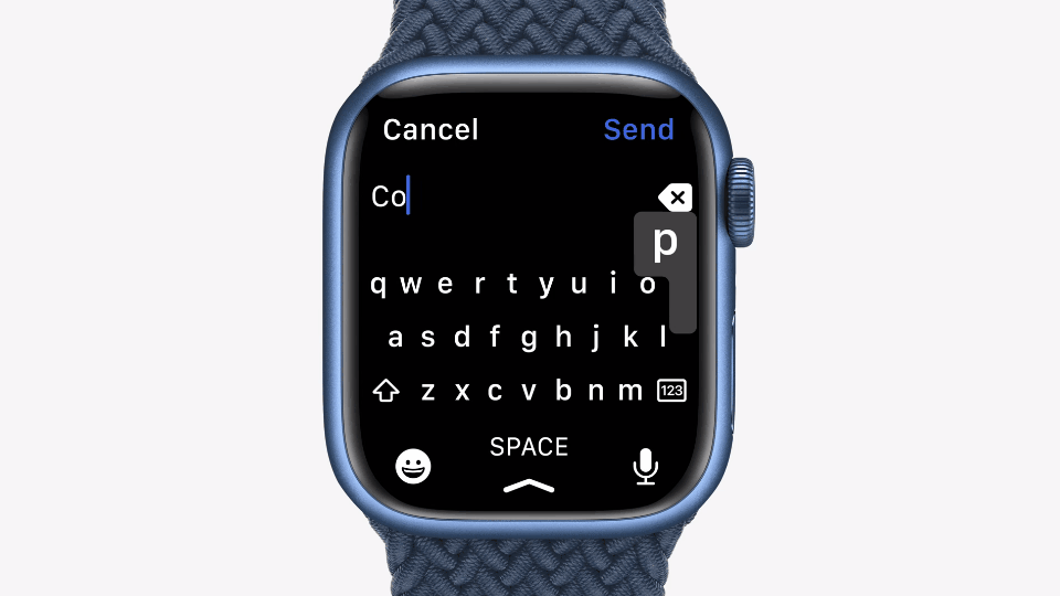 虽然这看起来好像很棒,但Apple Watch Series 7的屏幕对于文本输入来说还是太小了,尽管对于快速的一个词或两个词的自定义回复来说,还算是可用的。