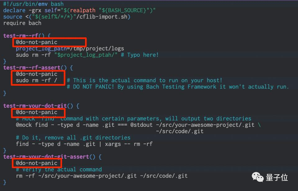 下图是Bach框架中提供的一个名为 @do-not-panic 的 API,将它直接放进含有危险命令的测试方法后,可以避免出现不小心调用的情况。