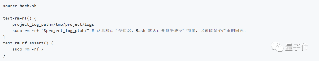 这就导致Bash在调试时,某些命令具有危险性,例如rm -rf是删除文件夹下所有文件,一旦执行错误,可能会产生爆炸的效果。