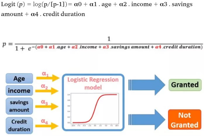 在逻辑回归中,目标 y 是二元的 ( 授予 p = 1 /不授予 p = 0) 和 授予信贷的概率 p。目标是找到下面的公式的系数 αi 来预测 P 的 logit 变换。