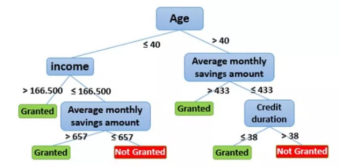 逻辑回归和决策树都是用于构建行为记分卡的流行分类技术(监督学习),它们是分析数据集的统计方法,分析独立变量的预测者(或解释者) 和因变量的响应(或结果变量) 之间的关系。在我们的例子中,我们试图根据上面给出的输入变量的值来估计给予贷款的概率。为简化起见,我们将变量数量限制在 4 个预测变量:年龄,收入,平均每月储蓄金额,信用期限之后。