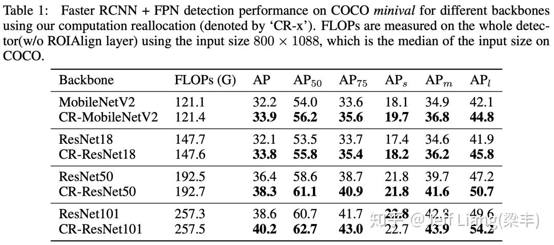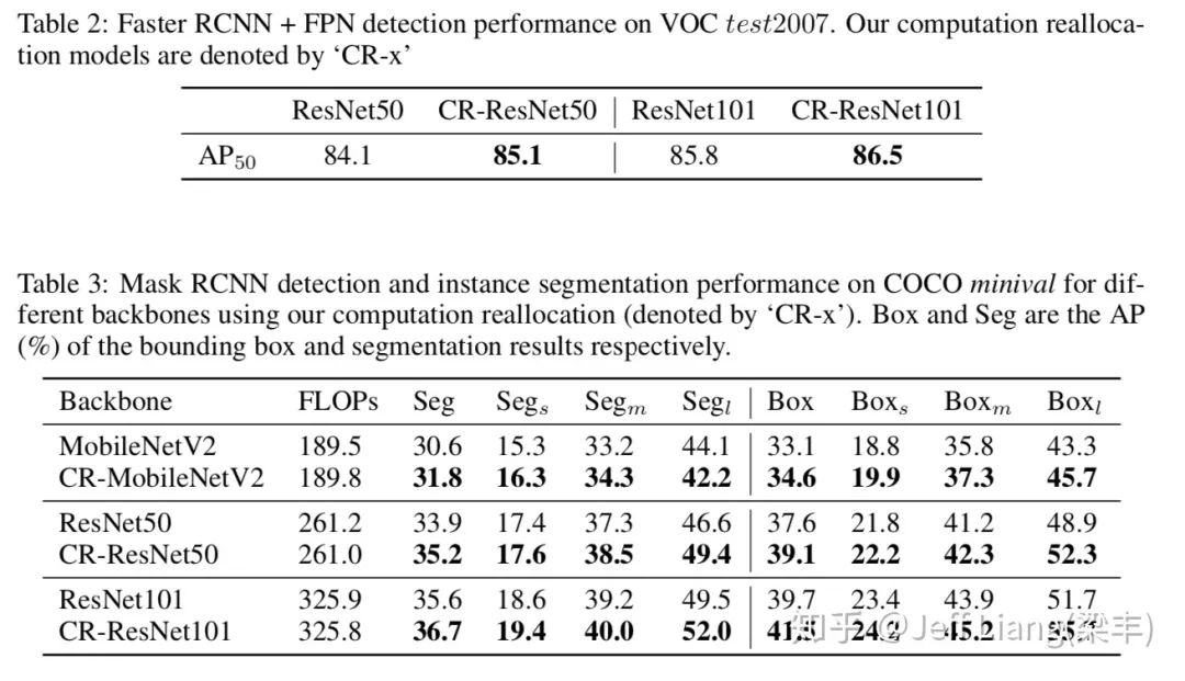 那通过什么方式可能改变算力分配,进而改变ERF影响最后结果呢?我们提出了两种方向,在不同分辨率(feature resolution)和不同的采样位置(spatial position)进行算力分配。我们做了大量的试验,从轻量级的MobileNetV2到重量级的ResNeXt101,都获得了稳定的涨点。我们搜索出来的模型也有非常好的可迁移性,可以迁移到其他的neck(NAS-FPN),其他的数据VOC,其他的任务实例分割(Mask RCNN)。