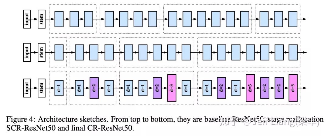 这个时候,我们将网络的有效感受野ERF[6]与网络算力分配模式联系了起来。在Faster RCNN + FPN这一经典baseline中,我们希望FPN的各层有合适能力去检测对应大小的物体(Anchor Size)。当我们画出R50-FPN的各层的ERF时,发现对于P3而言(小物体),ERF挺大有冗余,但对于P5而言(大物体),ERF又不够有点稀疏,见下图Figure 1右上角。这也就是直接应用Res50作为backbone的问题,经过我们的stage的重分配之后,可以明显看到各层FPN有更加平衡的ERF,保证了最后的性能。