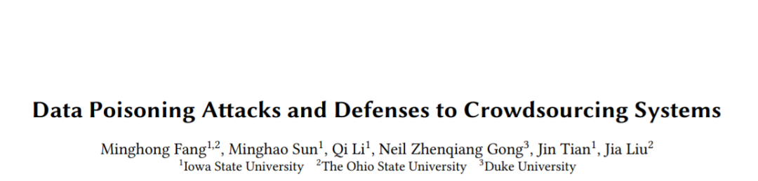 大数据分析的一个关键挑战是如何收集大量(标记)数据。众包旨在通过聚合和估算来自广泛的客户/用户的高质量数据(如文本的情感标签)来解决这一挑战。现有的众包研究集中于设计新的方法来提高来自不可靠/嘈杂客户端的聚合数据质量。然而,迄今为止,这种众包系统的安全方面仍未得到充分的探索。我们的目标是在这项工作中填补这一缺口。具体来说,我们表明众包很容易受到数据中毒攻击,即恶意客户端提供精心制作的数据来破坏聚合数据。我们将我们所提议的数据中毒攻击规划为一个优化问题,使聚合数据的错误最大化。我们在一个合成的和两个真实的基准数据集上的评估结果表明,所提出的攻击可以显著地增加聚合数据的估计误差。我们还提出了两种防御来减少恶意客户端的影响。我们的实证结果表明,所提出的防御方法可以显著降低数据中毒攻击的估计误差。