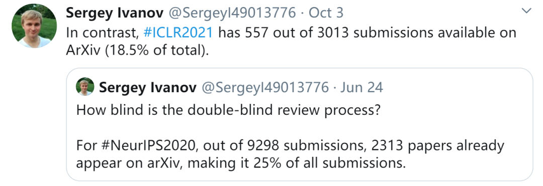 相比之下,ICLR 2021有557篇论文发在arXiv上,占所有提交论文的25%。