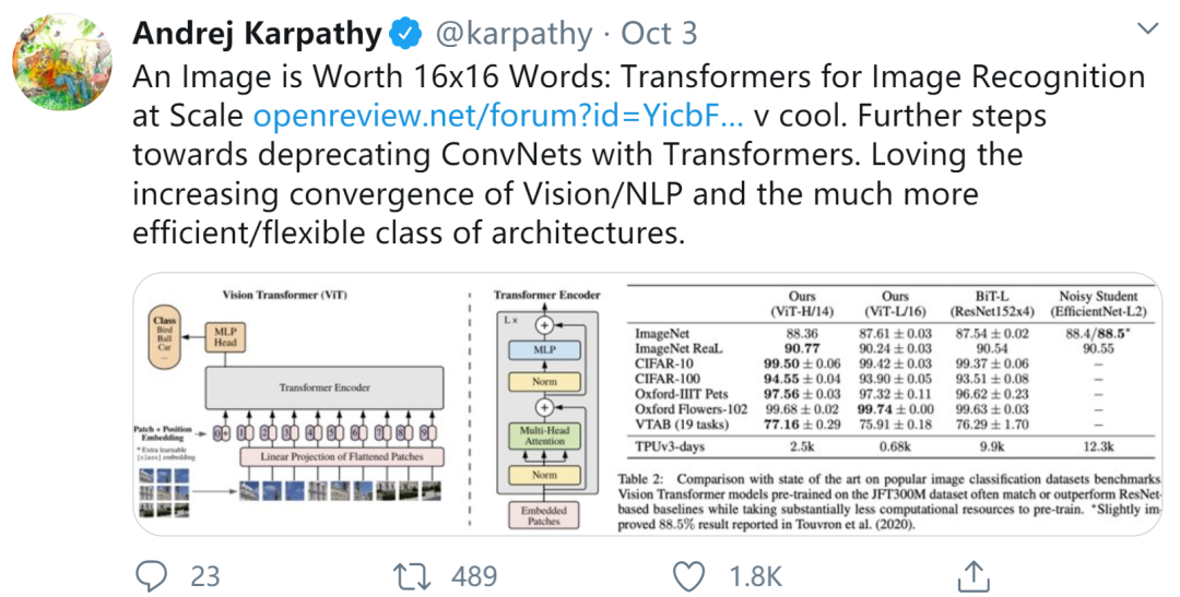 在推特上,斯坦福大学CS博士、特斯拉AI总监 Andrej Karpathy转发了该论文,并表示[乐意见到计算机视觉和NLP领域更高效/灵活的体系结构的日益融合]。