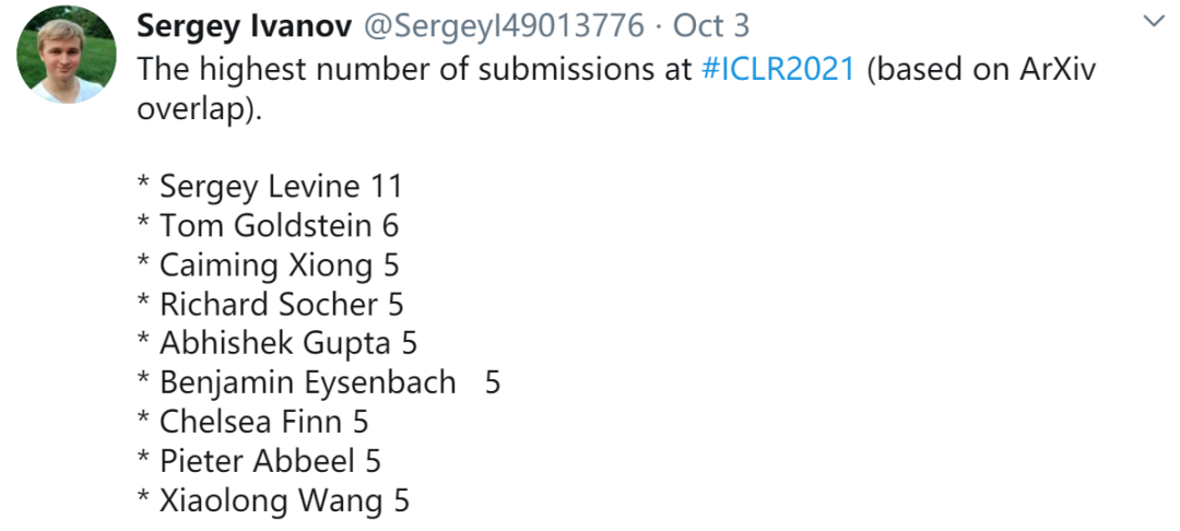 最后Sergey Ivanov公布了目前为止基于ArXiv统计的ICLR 2021个人投稿排行榜: