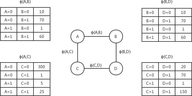 无向图因为没有方向,也就没有CPD,但是无向图模型还是有自己的办法。无向图模型中同样的一个个类似CPD的东西被称作Factor ,像有向图中的节点拥有自己的CPD一样,Factor也有自己的表示形式。它也可以像CPD一样用表格的形式表示。