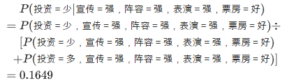 计算条件概率(Conditional Probability)。当一个电影宣传强、阵容强、表演强、票房好时,它(竟然)投资少的概率有多大?公式如下:
