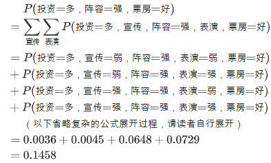 计算边际概率(Marginal Probability)。投资多,阵容强,票房好,其他无所谓的电影出现的概率有多大?公式如下: