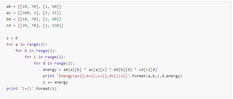这里举一个例子,如果将上面的代码做一些改动,去求A、B的边际概率,就有: