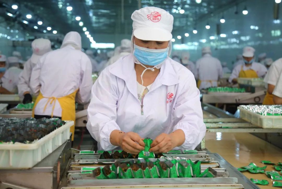 产业园1公里处开始,路灯上挂着吉祥物——一个肥胖胖的芥菜上有张笑脸。芥菜田也被画成一幅画,涂在民房上。产业园的墙上印着“芥菜飘香,食品安全要谨记”。招聘广告上写着,35-55岁的女工,能拿到3200元到5000元的工资,这和县城公务员的工资差不多。