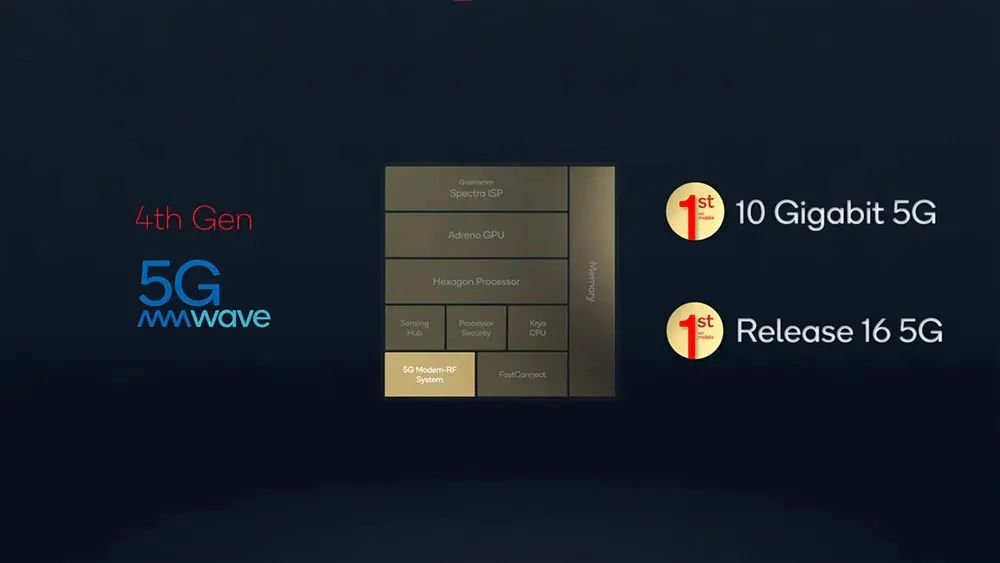 首先一些基本信息,今年的骁龙 8 采用三星 4nm 制程工艺,搭载 X65 调制解调器以及射频前端,下行速率则首次达到了 10Gbps,上行 3.5Gbps,且支持 3GPP R16 的标准。