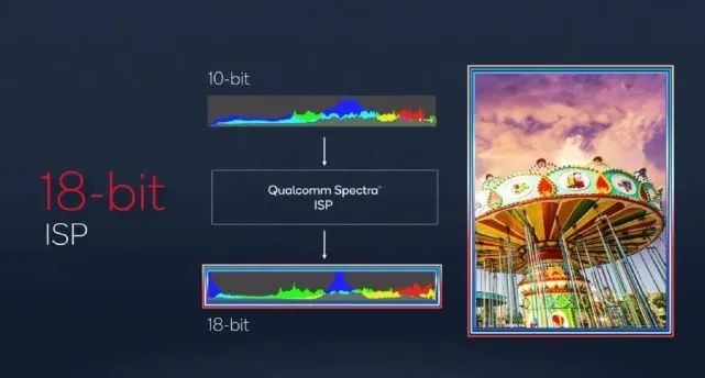 影像方面。今年的骁龙 8 依然沿用了去年的 3 ISP 架构,不过从之前的 14-bit 升级到了 18-bit,也就是说,我们拍照可以直接导出 18-bit 的 RAW,而支持 18-bit 的 ISP 可以让色彩过度更平滑,理论上动态范围可以增加 4 挡。