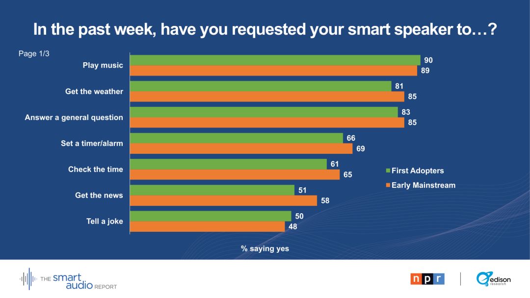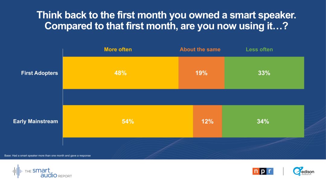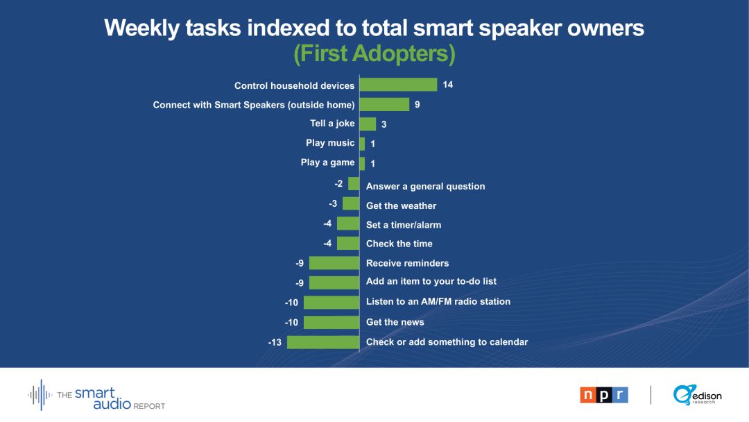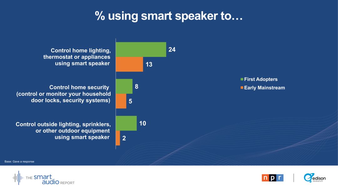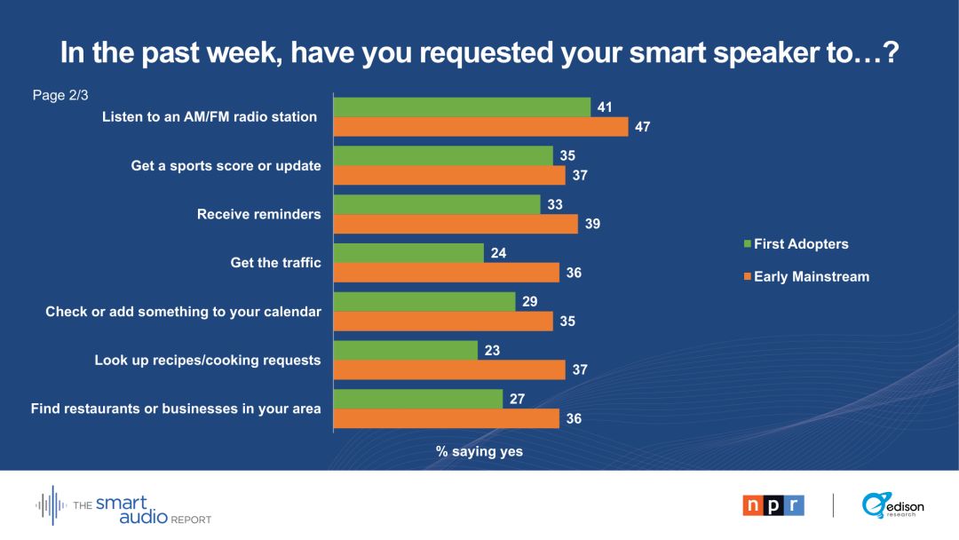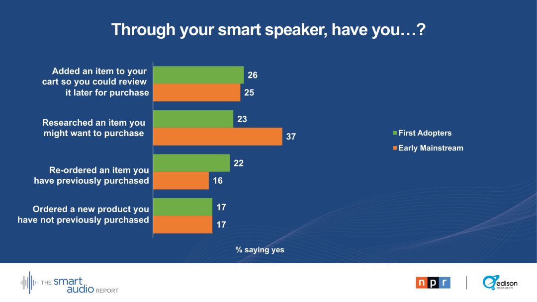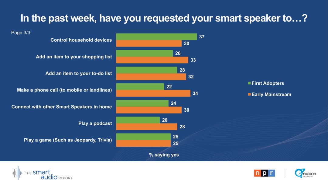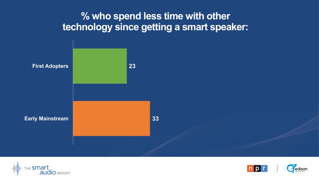 29 %的早期主流用户表示,他们的智能音箱正在取代电视。28 %的早期主流用户通过智能音箱收听播客。