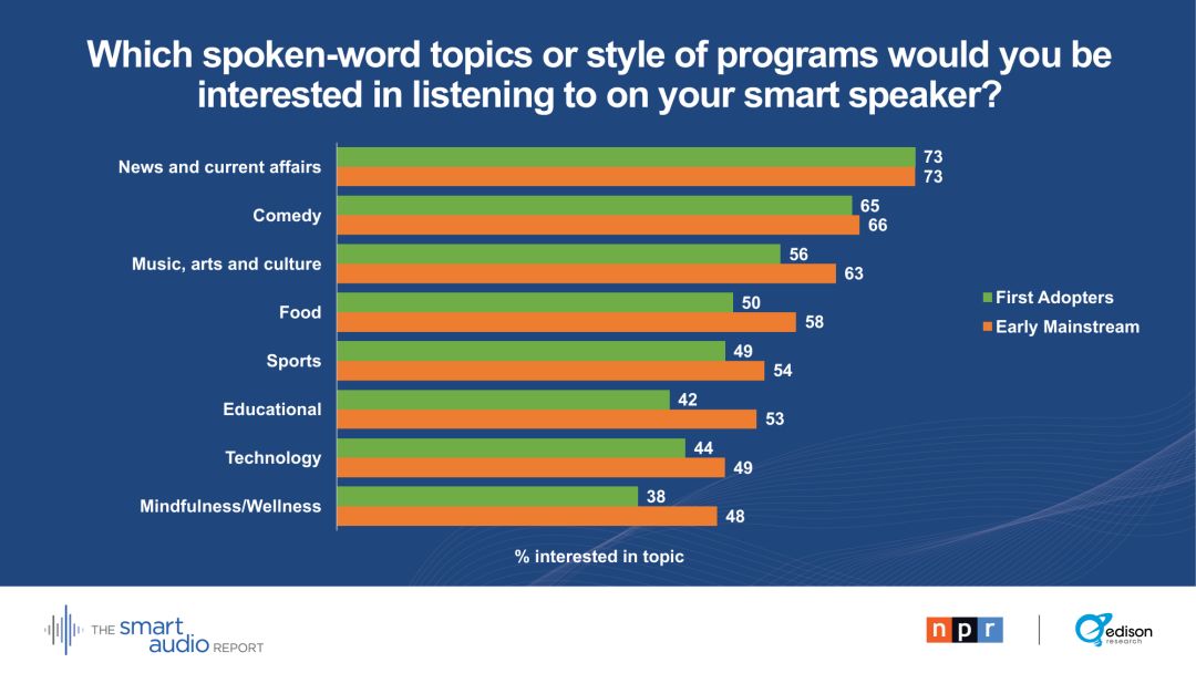 73 %的智能音箱使用者把“新闻时事”作为他们最感兴趣的话题。在打算购买另一台智能音箱的智能扬声器所有者中,有五分之三的人为了在家里更多的房间里听新闻。