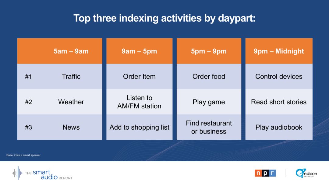 NPR 的 CMO, Meg Goldthwaite说:“智能音箱所有者关闭电视,关闭笔记本电脑,花更多时间听新闻、音乐、播客和书籍。这助长了对更多音频内容的需求。”