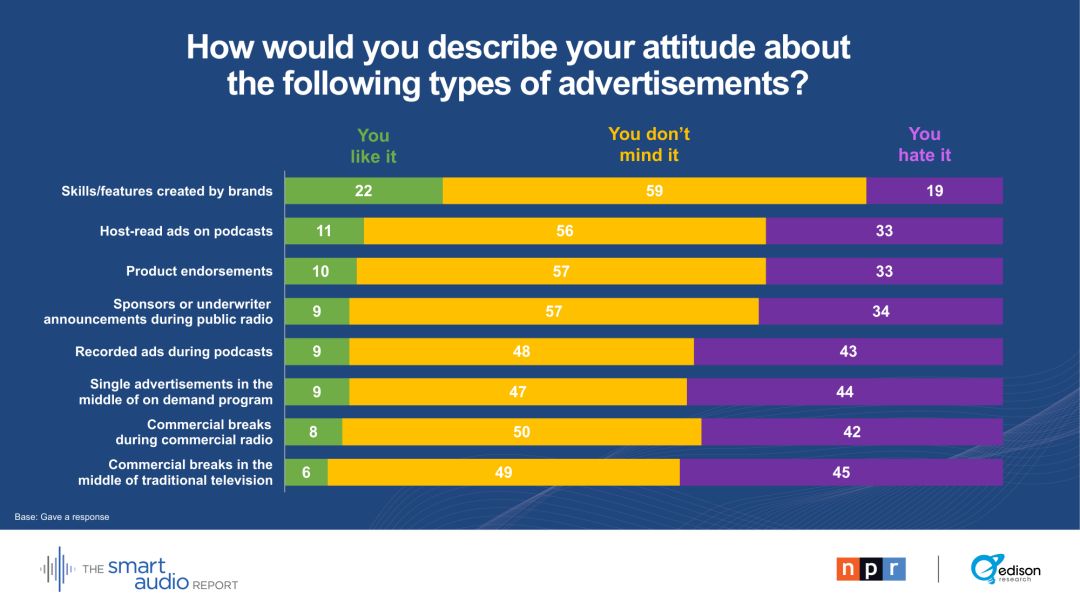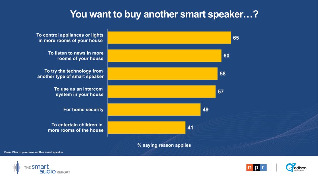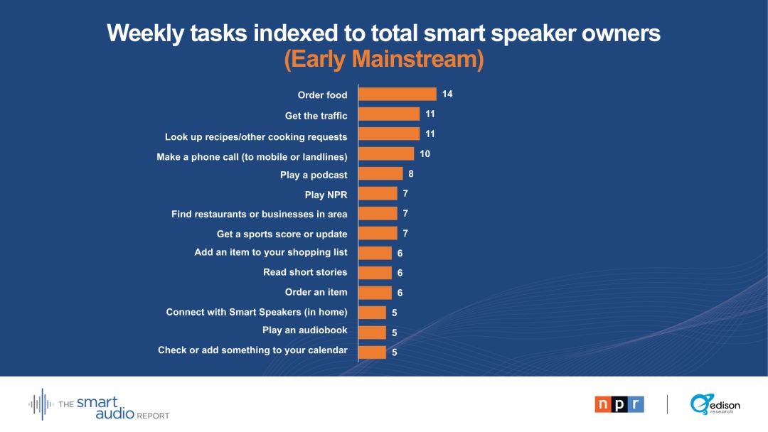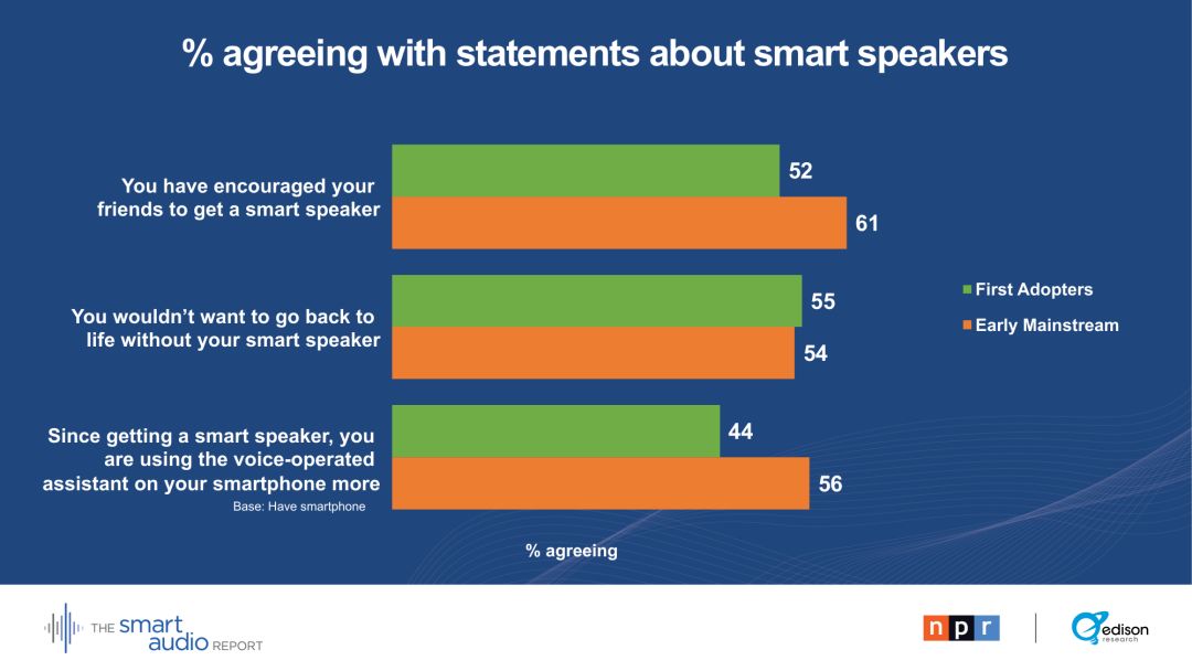 “在拥有智能音箱至少一年的家庭中,它们现在是消费音频内容的头号设备。这对媒体和广告界的任何人都有深远的影响。对数百万美国人来说,智能音箱才是真正的新收音机。”----爱迪生研究公司高级副总裁汤姆·韦伯斯特