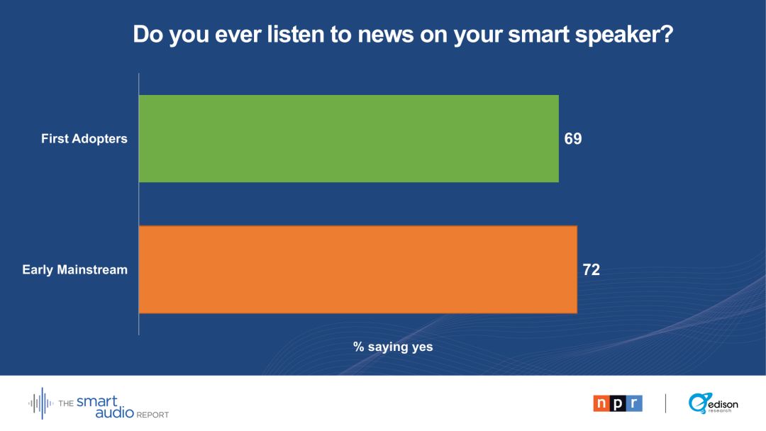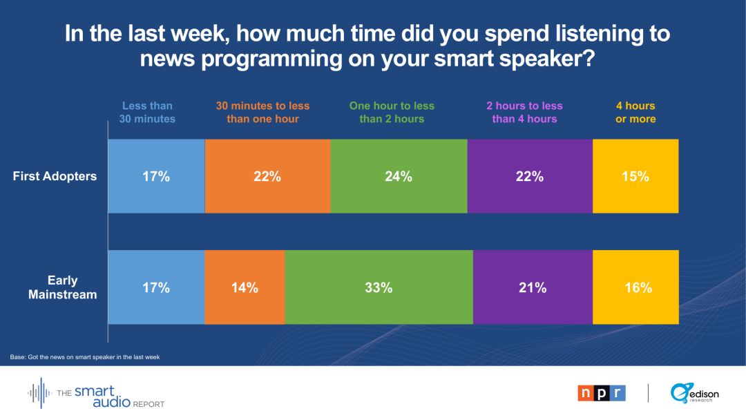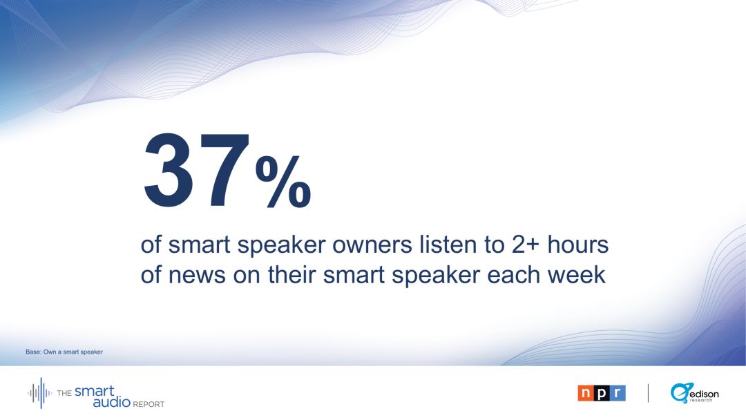 听新闻成为第一批智能音箱采用者和早期主流用户使用的重要驱动力: 37 %的智能音箱所有者在上周至少听了两个小时的新闻。根据2018年春季发布的消息,平台上有更多的新闻需求,这是推动智能音箱销售的一项动力。