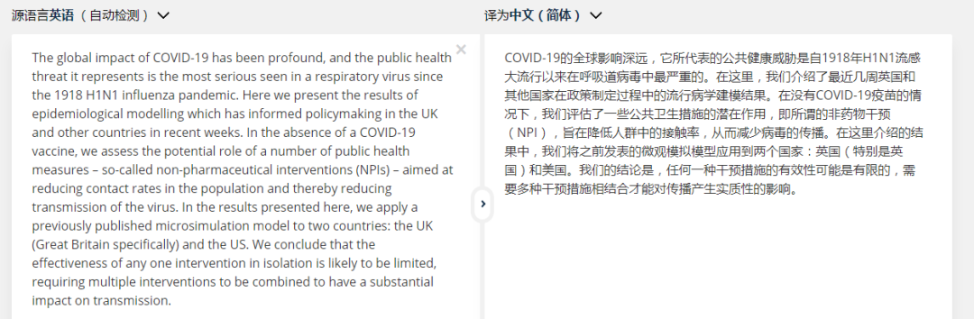 原文:The global impact of COVID-19 has been profound, and the public health threat it represents is the most serious seen in a respiratory virus since the 1918 H1N1 influenza pandemic. Here we present the results of epidemiological modelling which has informed policymaking in the UK and other countries in recent weeks. In the absence of a COVID-19 vaccine, we assess the potential role of a number of public health measures – so-called non-pharmaceutical interventions (NPIs) – aimed at reducing contact rates in the population and thereby reducing transmission of the virus. In the results presented here, we apply a previously published microsimulation model to two countries: the UK (Great Britain specifically) and the US. We conclude that the effectiveness of any one intervention in isolation is likely to be limited, requiring multiple interventions to be combined to have a substantial impact on transmission.