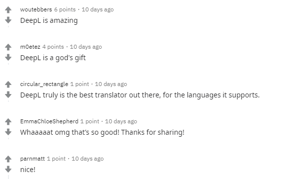 掌握多国语言的Techcrunch编辑Frederic曾这么评价DeepL:“谷歌翻译的风格非常直接,但却错过了一些细节和习语(或者把这些习语翻译错了),而 DeepL 经常可以提供更加自然的翻译效果,就像训练有素的人类翻译一样。”