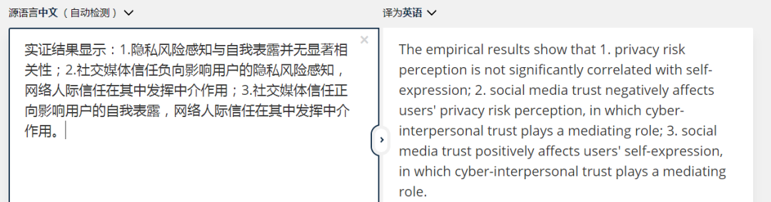 从翻译结果上看,五位选手给出的答案都比较让人满意,句型和语法也都没有问题,只是在一些具体的用词上各有千秋。比如,“自我表露”,DeepL和微软用的是“self-expression”,其余三位选手用的是“self-disclosure”;而“网络人际信任”,有道、百度和微软译成“network interpersonal trust”,谷歌给出“online interpersonal trust”的答案,DeepL则译为“cyber-interpersonal trust”。