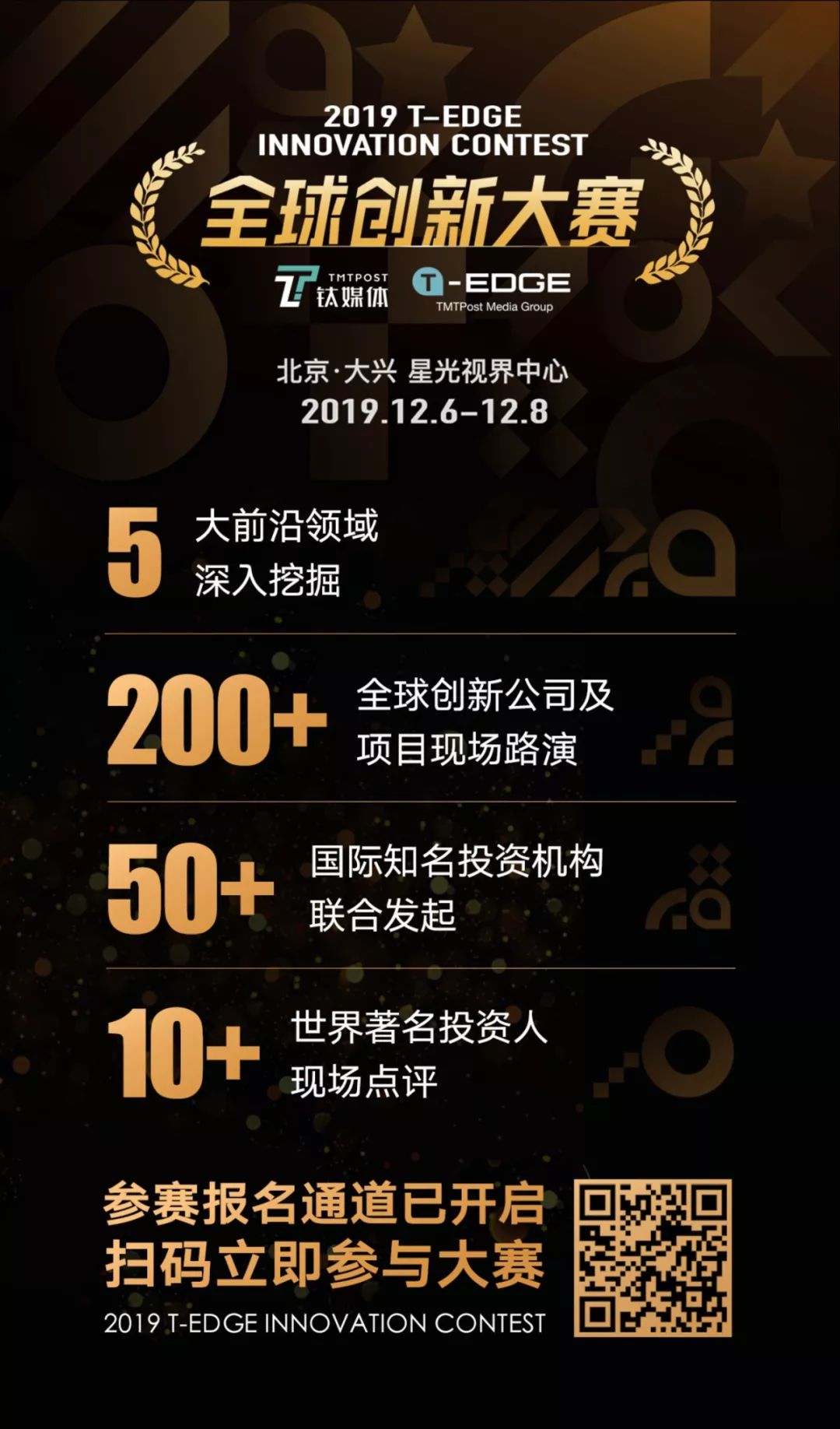 T-EDGE全球创新大赛报名通道现已开通,我们诚挚的邀请国内外创新创业企业及项目踊跃报名参与。如果你的公司或者项目希望成为2019年明星创业“独角兽”,那就来参赛吧!识别下方海报二维码,进入报名链接。