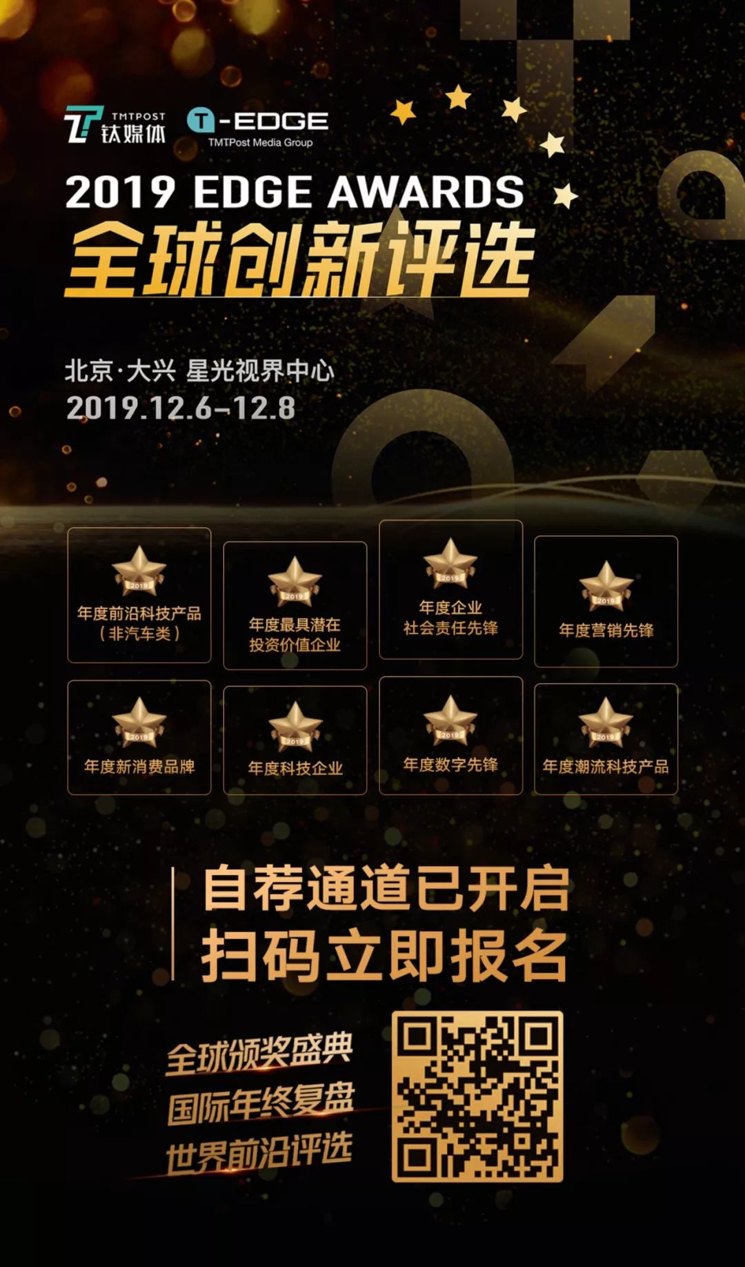 与此同时,钛媒体 EDGE Awards 全球创新评选正处于提名阶段,您可以在陆续发布的参评名单中为您看好的年度企业或者产品/项目投出宝贵的一票。同时向您发出诚挚邀请,于2019年12月8日晚来到钛媒体T-EDGE全球创新颁奖盛典的现场,与钛媒体共同见证荣耀奖项的诞生。