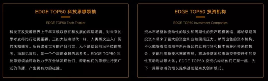 EDGE TOP50 是T-EDGE作为全球创新平台的前沿价值榜单,始终以T-EDGE前沿眼光发掘全球范围内的创新力量。今年更是聚焦具有TECH THINK的科技个人与机构,他们是真正思考科技边界的前沿领袖,是突破精神与创新能力的持续发掘者。未来,T-EDGE还将和他们一起,触摸前沿感受未来。