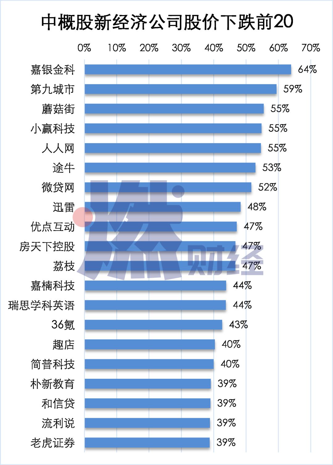 先看美股。整体而言,在美上市的100多家新经济公司,85%股价下跌,15%股价上涨,平均跌幅为20%。以下是中概股跌幅最大的20家新经济公司。