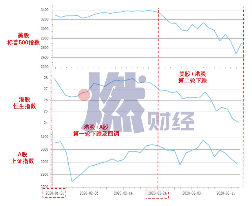 我们结合疫情,将1月21日至3月13日这个时间区间,做进一步的细分,会发现2月24日也是一个至关重要的时间节点。这一天,韩国将疫情预警上调至最高级别,意味着疫情开始向全球扩散,当天美国标普500指数暴跌3.32%。实际上从2月24日开始,美股就已经开启下跌通道了,但大部分人直到3月12日美股熔断,才知道美股已经狂跌不止了。