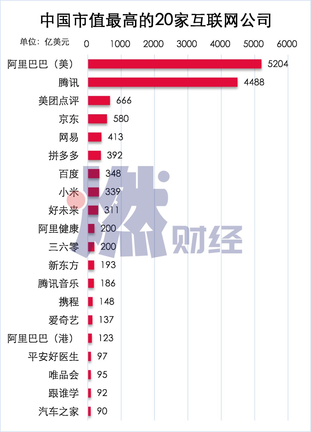 从图中可以看到,中国互联网前五的排位,已经变成了阿里、腾讯、美团、京东、网易,拼多多排在第六,百度则被甩到了第七。这20强中,阿里占了三个,美股的阿里、港股的阿里,还有一个阿里健康,市值都排在中国互联网前20。