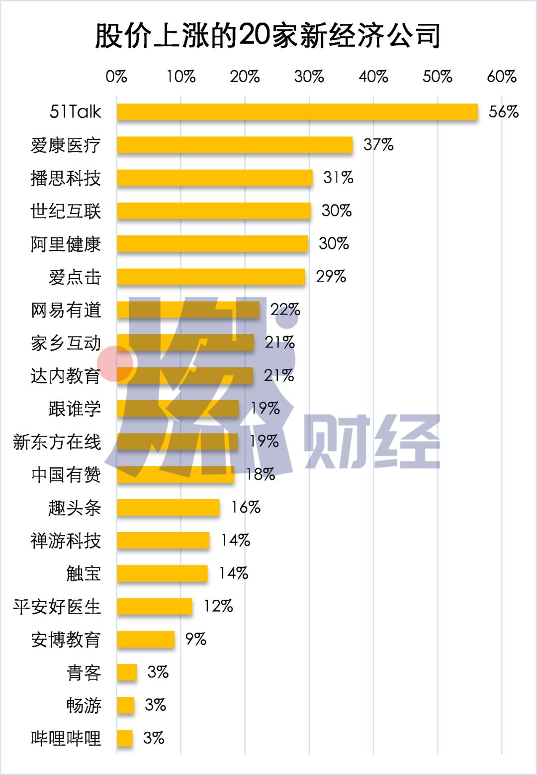 在线教育在疫情期间大爆发。这20家股价上涨的公司中,有6家属于在线教育行业。51talk上涨56%,领涨中概股,网易有道、达内教育、跟谁学、新东方在线都实现了20%左右的涨幅。