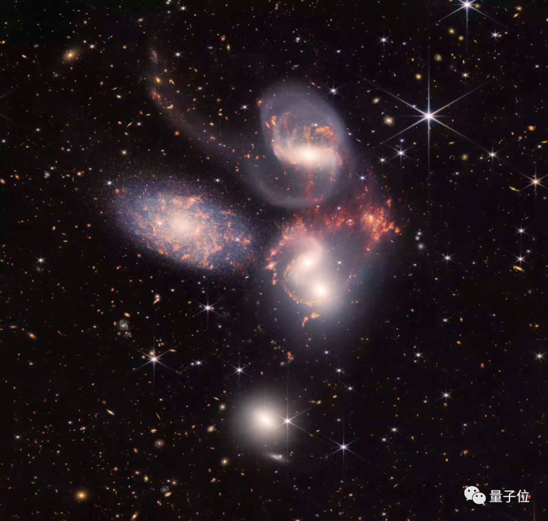 凭借其强大的红外视觉和极高的空间分辨率,韦布展示了这个星系群中前所未有的细节。数以百万计的年轻恒星闪闪发光的星团和新恒星诞生的星暴区域为这幅图像增光添彩。