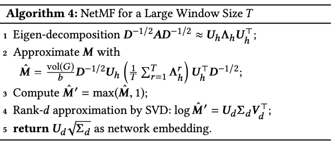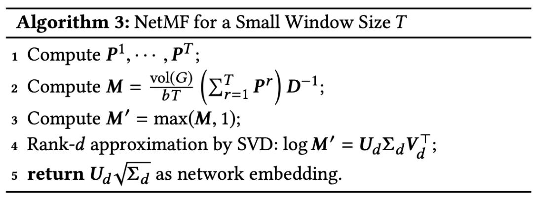 较小的窗口T对应较低的运算量,此时应用NetMF不必考虑对M近似,对应原文的算法3,先计算每个窗口下的P,代入计算出M,最后应用奇异值分解;此处第3步的M'=max(M, 1)是为了消除log(0)的情况,同时log(1) = 0也能让矩阵稠密程度降低