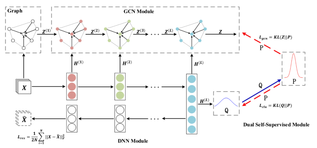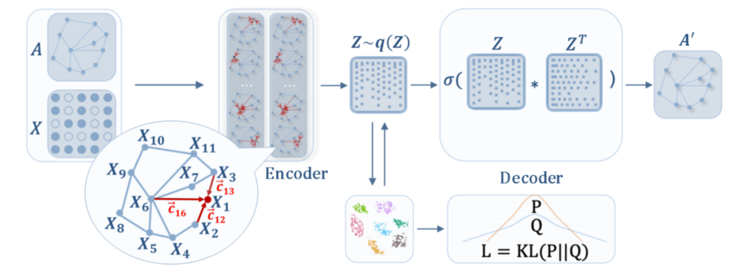 深度学习背景下常见的图聚类方法基于自编码器,本篇提出的DAEGC模型也类似,如下图所示,模型上半部分通过自编码器重构网络表示,下半部分让网络表示对应的分布Q拟合代表聚类信息的分布P;除此之外,本篇的特点大概就是在生成表示向量Z处加入注意力机制,将更复杂的聚合函数应用于本框架并无障碍,下面的SDCN模型就从图结构信息考虑从而将GCN加入聚合函数