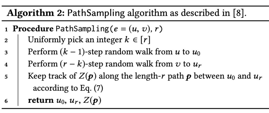 其中第5步对应边采样算法(算法2):根据真实挑选的边e=(u, v),在u和v的特定范围邻居中采样新的节点(u0, ur)作为新边,并通过新边间通路长度算得新边权重
