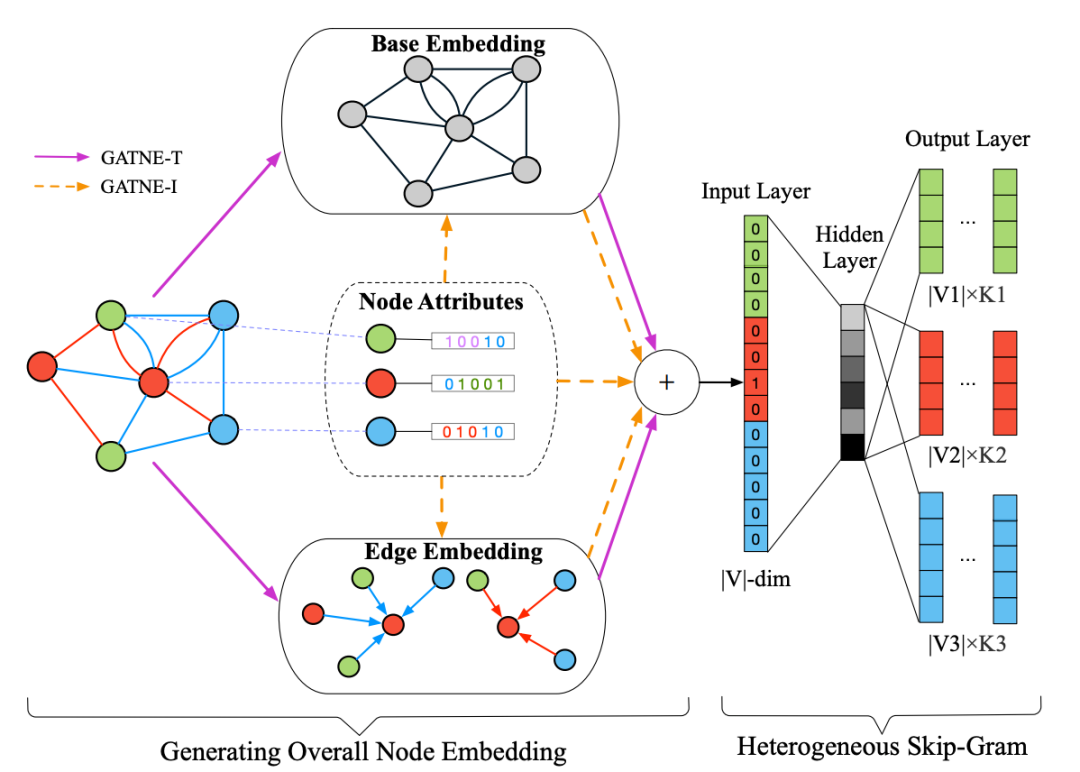 虽说是更复杂的图结构,但GATNE的思路非常直观,如下图所示,除了常规通过节点邻接关系学习到的Base Embedding,节点间的边可能蕴含不同的属性,因此完整的图结构是由不同类别的边连接而成的子图之和,这里需要学习各类边的Edge Embedding,每个节点最终的向量表示就是对应Edge和Base表示的组合,因为线性组合无法体现节点之间及不同类边的影响,因而在concat操作后还会用注意力机制为不同表示加权