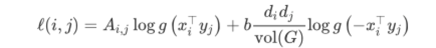 根据LINE中作者的建议,对节点j的负采样可正比于节点度数d的0.75次方,下面的公式里简化为正比于d,可以将损失函数改写为