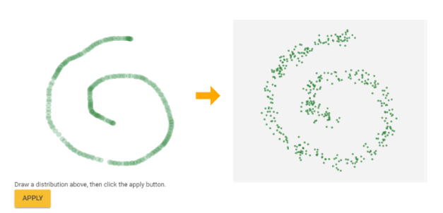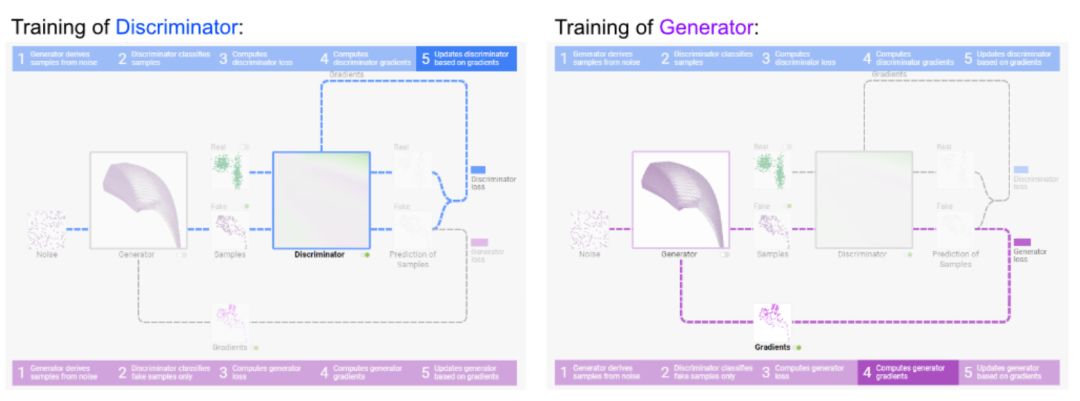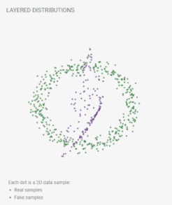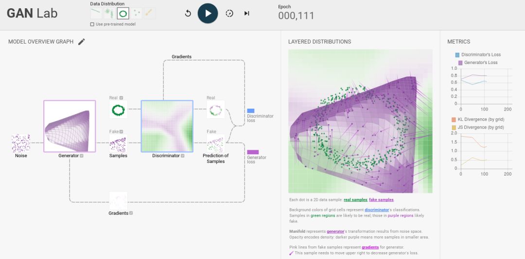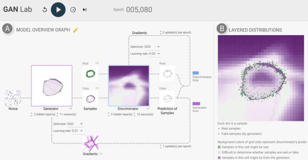 而右侧的数据分布视图中,除了原先的绿点(真实样本),我们还能看到一些紫点(生成样本)。在训练过程中,生成样本的位置持续更新,最终趋向于和真实样本的分布重叠。GAN Lab使用了绿色和紫色,而不是通常的绿色和红色,是因为不想让人将生成样本联想为负面情形。