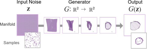 鼠标悬浮于生成网络(Generator),可以看到从随机噪声到生成样本的流形变换过程。透明度编码了密度,也就是说,透明度越高,生成数据点所在空间就越小。另外,勾选Generator下的小框后,在右侧的数据分布视图中也将显示生成数据点的流形。