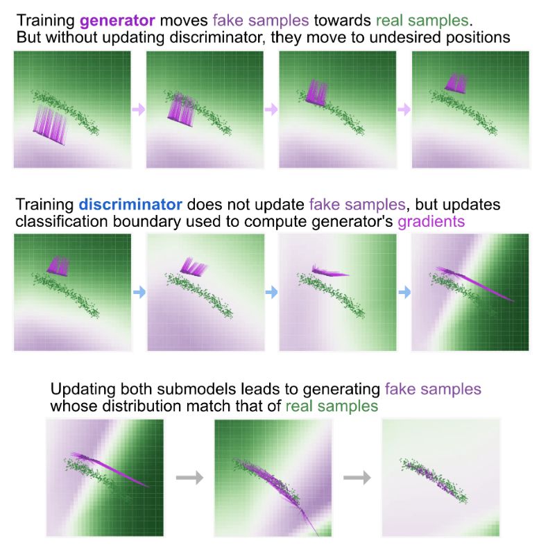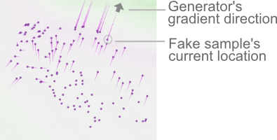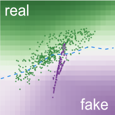 最后,右侧的数据分布视图用紫线可视化了生成网络的梯度。在训练中,梯度刺向背景热图的绿色区域,这意味着生成网络正努力尝试欺骗判别网络。