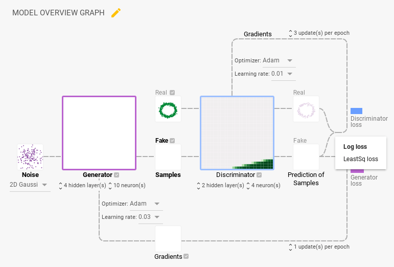 点击模型概览上的铅笔图标可以修改模型的超参数,包括随机噪声分布(均匀、高斯),生成网络和判别网络的隐藏层层数、每层神经元数、优化方法、学习率、损失函数。