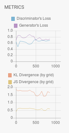 点击运行按钮,开始训练后,我们能在最右看到不断更新的测度,上为生成网络、判别网络的损失,下为KL散度和GL散度。