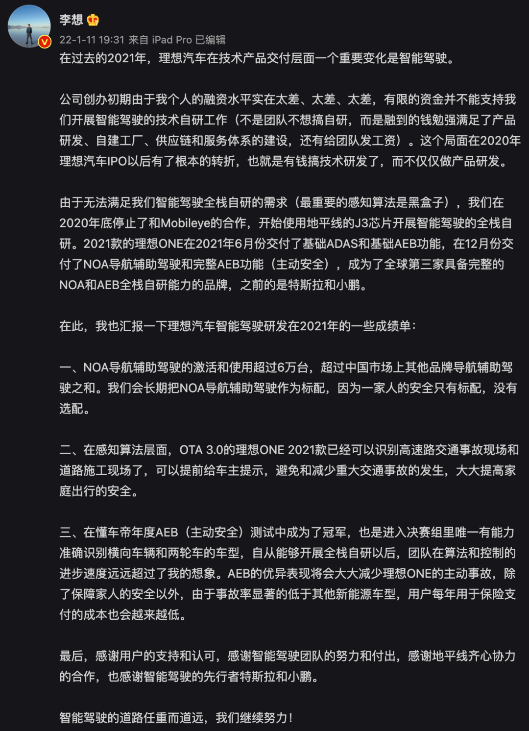 1月11日,理想汽车CEO李想发布微博长文,复盘了理想ONE智能驾驶研发在2021年的一些成绩。