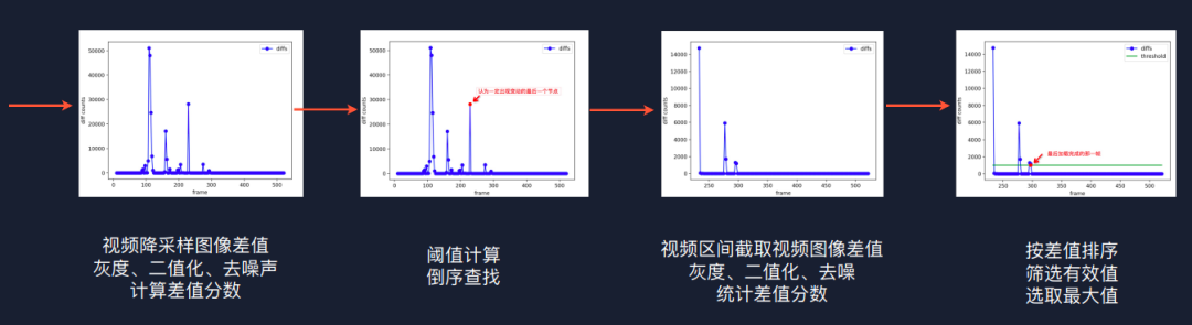 在体验评测自动化中,用户真实感受到的加载时长,等于从机械手点击到页面变化最后一帧的时间差,所以这里的关键在于,如何去判断页面加载的结束帧。我们采取视频降采样,根据灰度、二值化、去噪声计算图像的差值分数,即变化的程度,随后用实验测出合适的阀值,之后在整个视频区间,倒序查找阀值之上,最后一个差值,即为最后一帧,流程如下图所示: