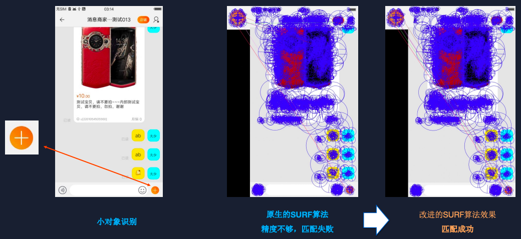 识别对象时,我们改进了 SURF 算法,叠加了 OCR 技术,增强了小图标识别能力。原生的 SURF 算法精度不够,对于特征相似的图像经常匹配失败。我们在特征向量上增加了斜率判断,匹配的成功率大幅度上升(如图中情况 3)。如特殊情况屏幕中存在多个相同小图标,则需要手动调参。