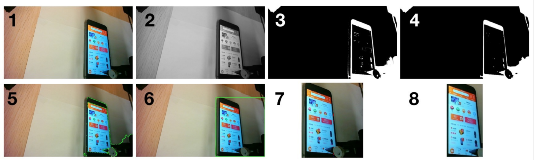 另外,图片和视频质量存在的品质差距,这增加了算法处理的难度。我们通过图像增强,直方图处理等,使得图像更易被算法识别;此外,我们需要从摄像头拍摄的画面分割出所需的手机屏幕。机械臂在执行时常常和手机屏幕相连,因此边缘检测时也会合为一体,难以拆分。手机屏幕、械臂及周边底色存在亮度差异,我们借此实现了 ROI 获取,过程如下图所示: